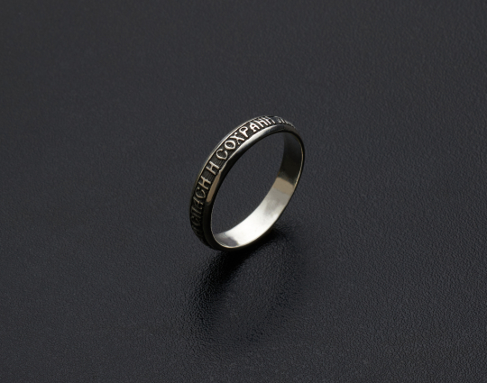 Строгое, лаконичное кольцо из серебра 925 пробы. Внешняя простота акцентирует внимание на содержании - на кольце находятся слова молитвы "Спаси и Сохрани". Это очень сильная молитва, которая читается в самых сложных ситуациях, при любых трудностях.