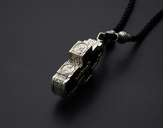 На лицевой стороне находится Распятие из серебра 925 пробы. Из него же сделана рамка вокруг деревянной основы. На ней находятся слова молитвы и образы Ангела - Хранителя, Николая Чудотворца, Матронушки и Богородицы.