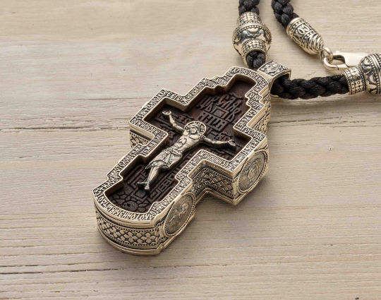 Крест дополнен текстильным гайтаном с молитвой "Спаси и сохрани" на концевиках.
