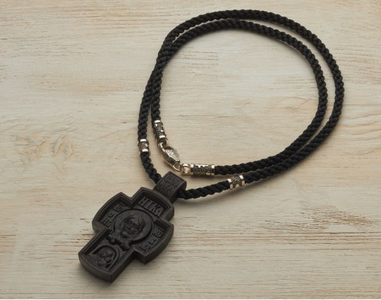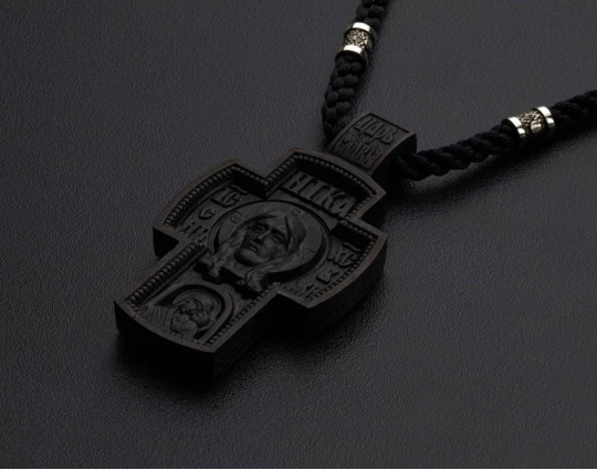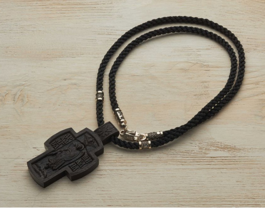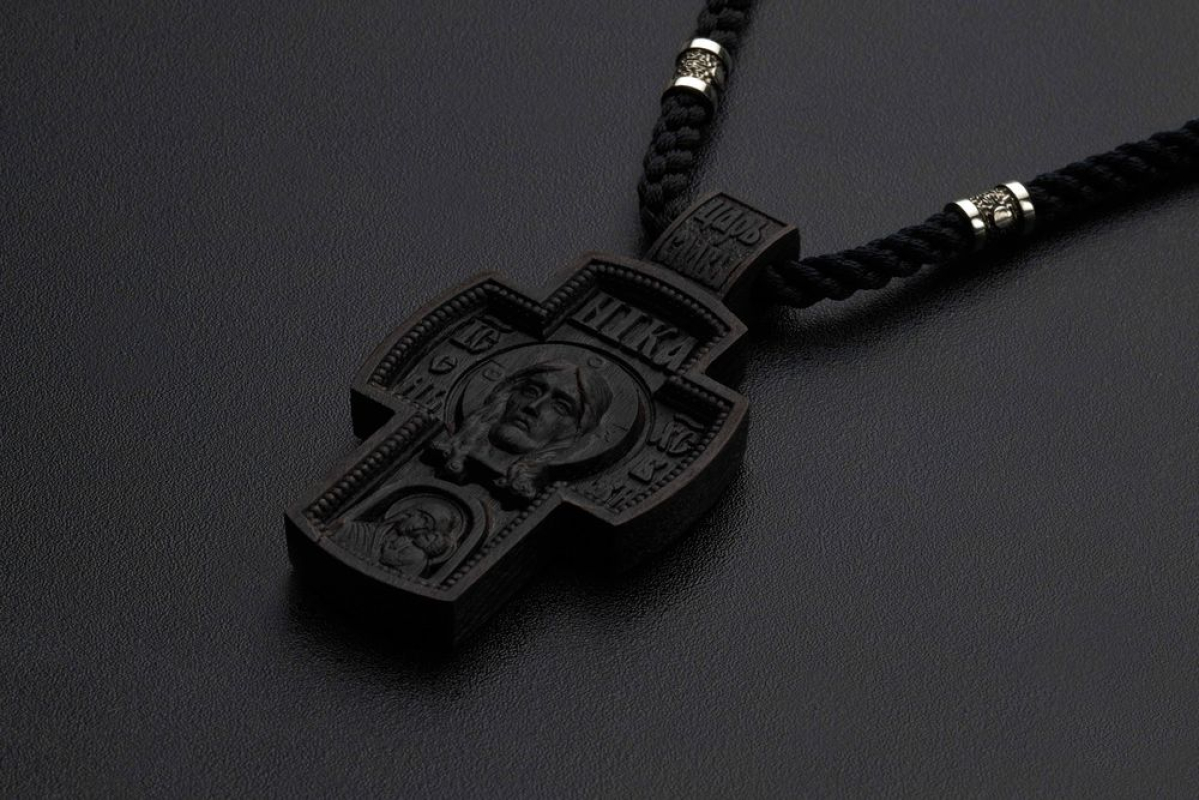 Деревянный крест выполнен из эбенового дерева. Это имеет символическое значение, особую значимость. Деревянная часть воспринимается как напоминание о Животворящем Кресте. Это как источник боли и страданий для Христа, так и спасение для любого верующего.