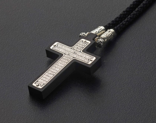 Православный крест из серебра и дерева с молитвой | b_krd_031 | Серебро 925, эбен, текстиль