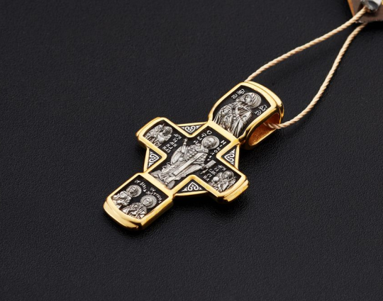Крест из серебра с позолоченной окантовкой и изображением Распятия Христа на лицевой части. Сбоку от него стоят Пресвятая Богородица и Иоанн Предтеча, склонившие свои головы в прошении. Над ними - икона Святой троицы. В нижней части креста изображен Георгий Победоносец во время своего великого подвига: победы над змием, который символизирует дьявола. Святой Георгий покровительствует воинам, защищает простых людей в опасности.
