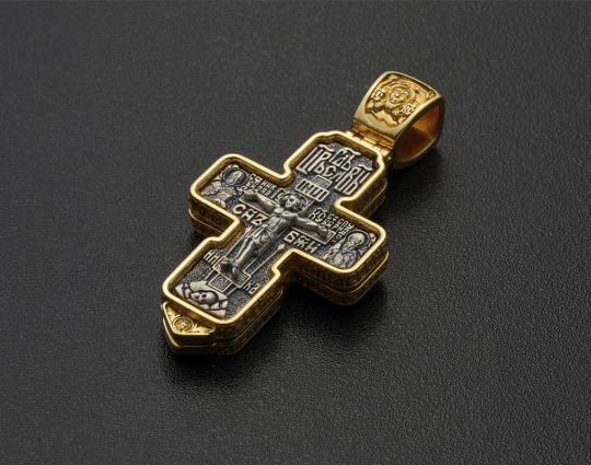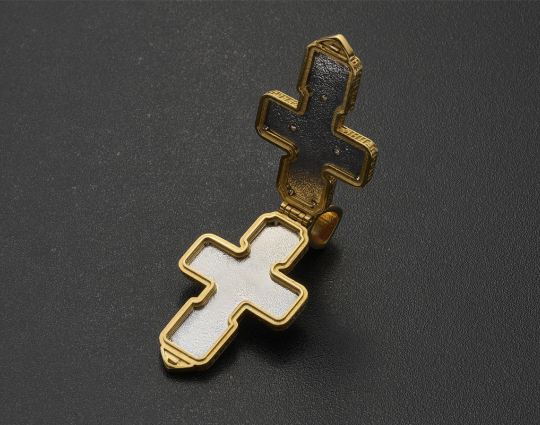 Православный серебряный нательный крестик выполнен из двух открывающихся частей. Его можно использовать как мощевик или складень. Фигура Спасителя Иисуса Христа на лицевой стороне распростерла объятия, желая обнять всё человечество.