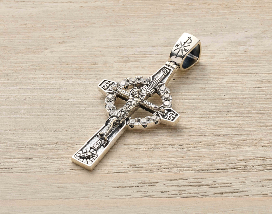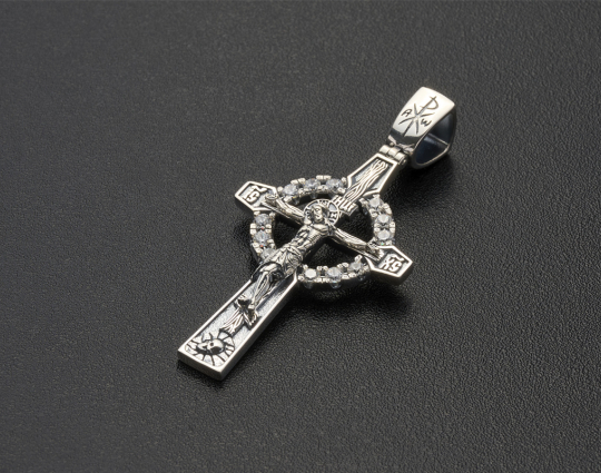 Православный крест с распятием традиционной формы с кругом - символом вечности, совершенства. А так же единства небесного и земного. С левой и правой стороны расположены буквы “IC” и “XC”, символизирующие Иисуса Христа.