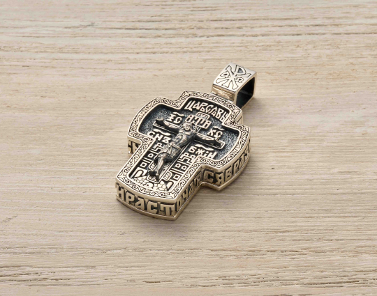 На лицевой стороне креста изображён образ Спасителя с надписью "Царь Славы", подчёркивающая Его божественное величие и царскую природу. Под фигурой Спасителя находится табличка с надписью "IHЦI", что означает "Иисус Назарянин, Царь Иудейский". Слева и справа от Спасителя видны сокращения "IC XC" ("Иисус Христос") и "СЫН БОЖИЙ", указывающие на Его божественное происхождение.