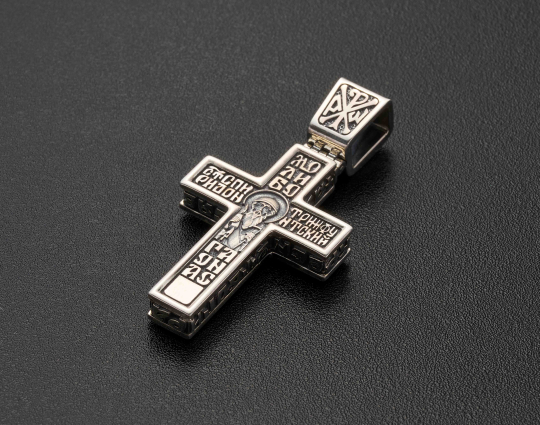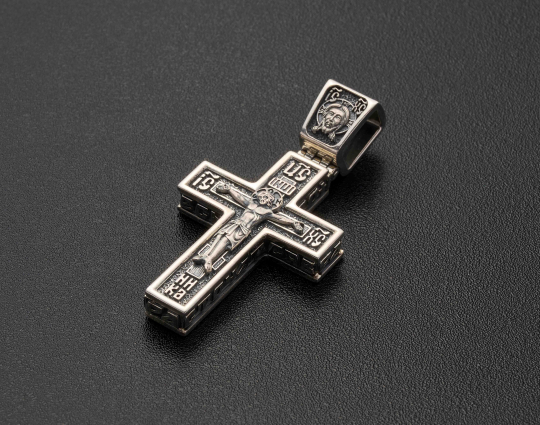 Православный крест из серебра с Распятием и образом святого Спиридона Тримифунтского. Над распятием находятся сокращения IC XC и ЦС. Они возвышают имя Иисуса Христа как Царя Славы, а надпись IНЦI напоминает о табличке, прибитой над головой Христа при распятии.