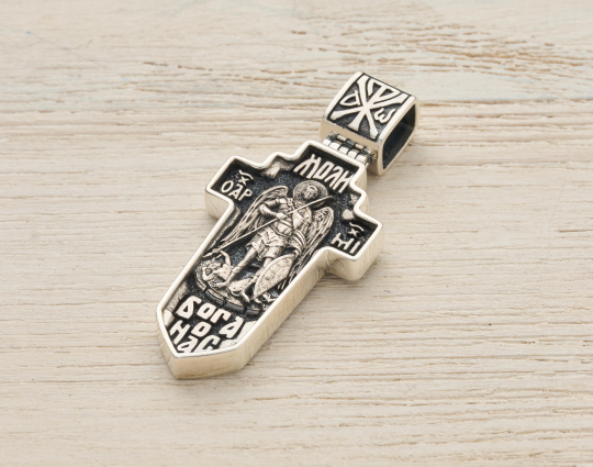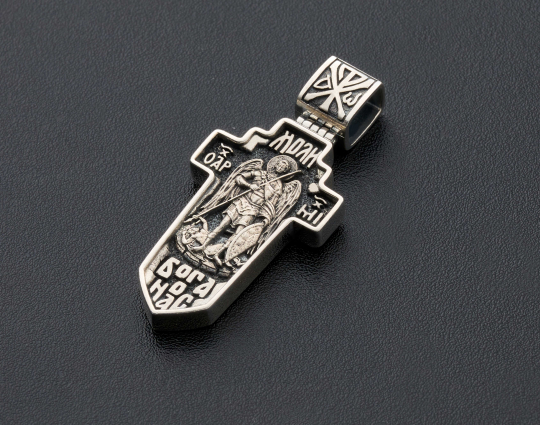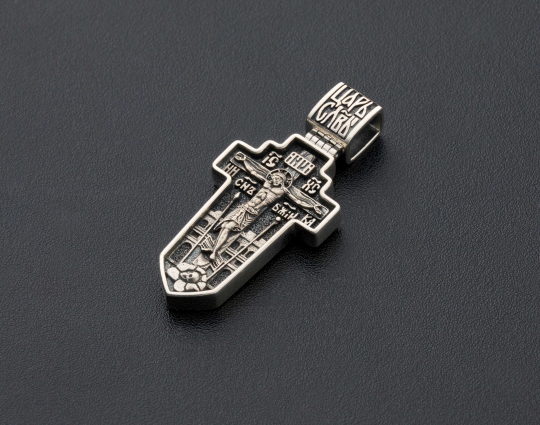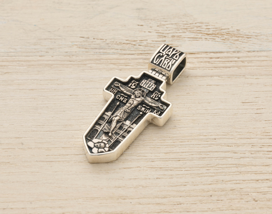 Православный крест из серебра 925 пробы с образом распятия Господа Иисуса Христа. Над головой находится надпись "Царь Славы", а на верхней перекладине креста – "ІН ЦІ", расшифровываемое как "Иисус из Назарета, Царь Иудейский". Буквы "IC XC" означают "Иисус Христос", а "НИКА" – "победа" над смертью.