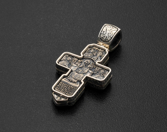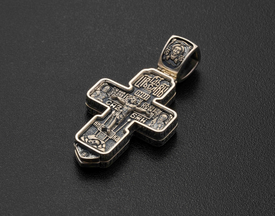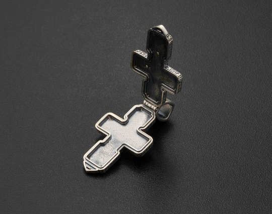 Православный серебряный нательный крестик выполнен из двух открывающихся частей. Его можно использовать как мощевик или складень. Фигура Спасителя Иисуса Христа на лицевой стороне распростерла объятия, желая обнять всё человечество.