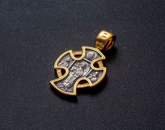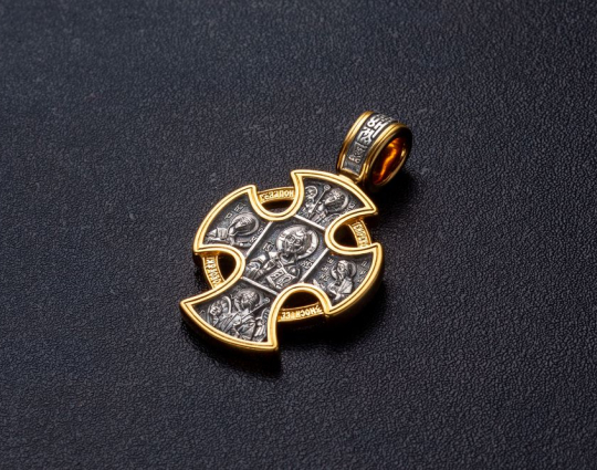 Необычной формы крест, который заключен в круг. Круг в этом изделии имеет не просто декоративную функцию, а демонстрирует всеобъемлющее значение веры. На лицевой стороне креста, в центре, расположен образ Господа Вседержителя. Он держит в руках книгу Нового Завета. Эта книга практически свод законов для любого верующего. Вокруг Иисуса расположились склоненные ему в молитве Богоматерь, Иоанн Креститель, архангелы Михаил и Гавриил.