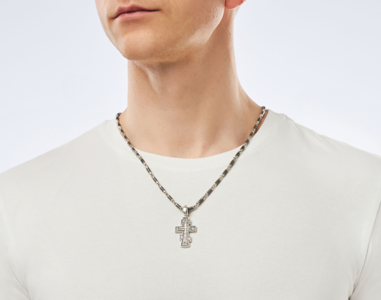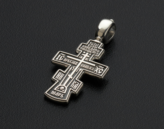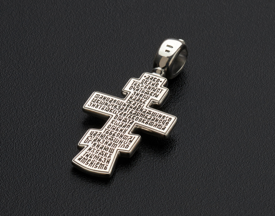 Восьмиконечный православный крест из серебра с Голгофой на лицевой стороне. На его поверхности находятся слова молитв. Внешне он напоминает древнерусский крест староверов.