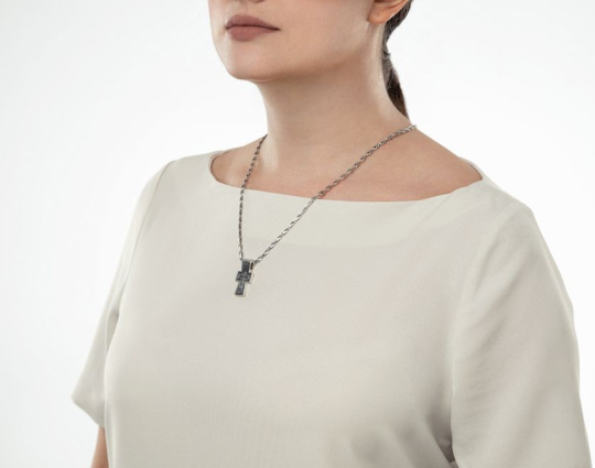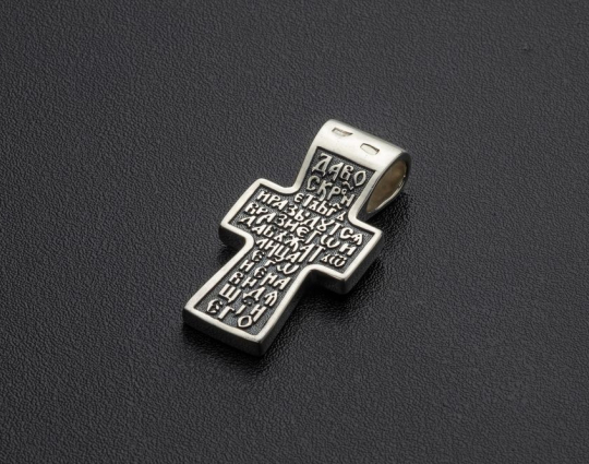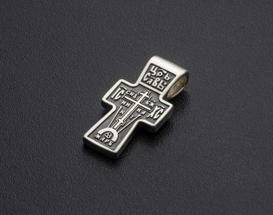 На лицевой стороне размещено изображение восьмиконечного Голгофского креста. Там же находится надпись "Иисус Христос - Сын Божий". Голгофский крест - образ креста Христова, символа Веры и её основных правил. На обратной стороне изделия - слова, обращенные к Господу.