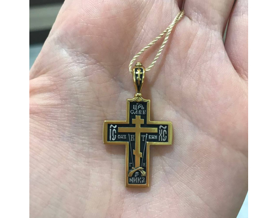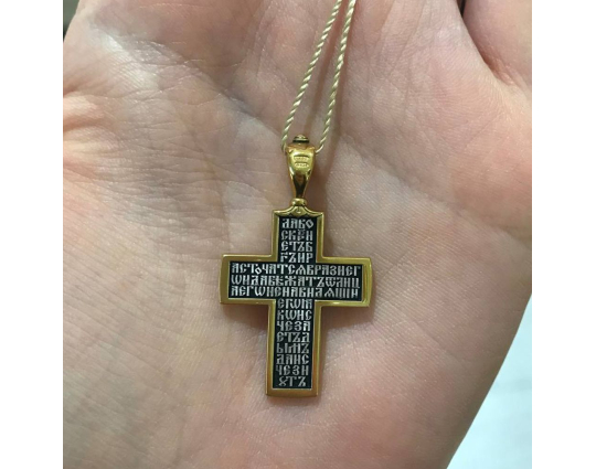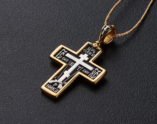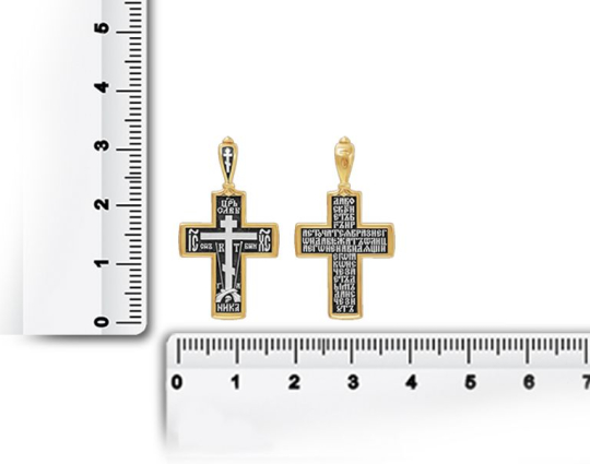 Изящный серебряный восьмиконечный крест с позолотой, который является знаком Распятого Иисуса на Голгофе. На обратной стороне изделия - начальные слова из молитвы Животворящему кресту.