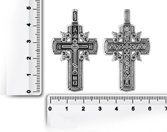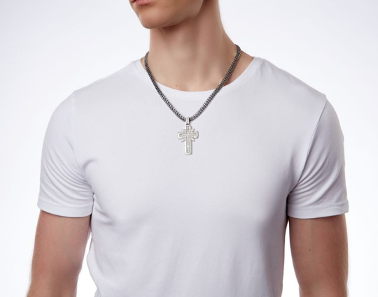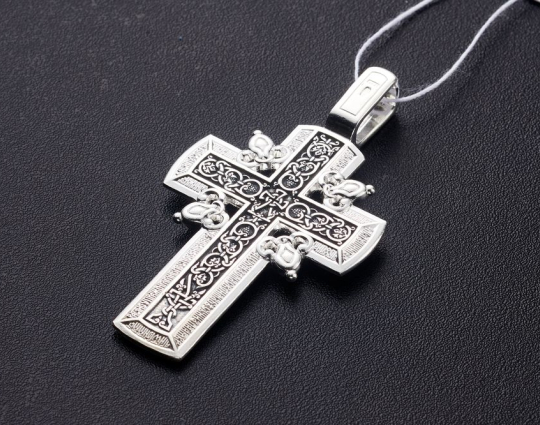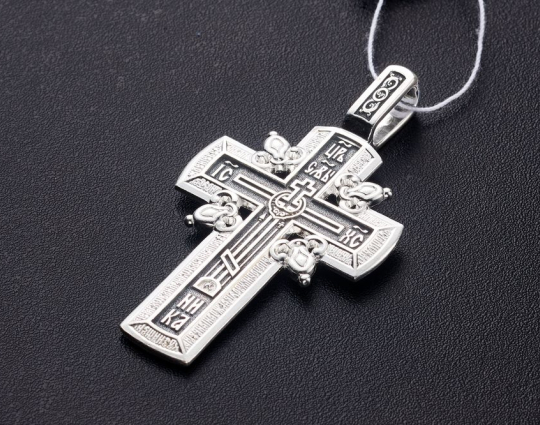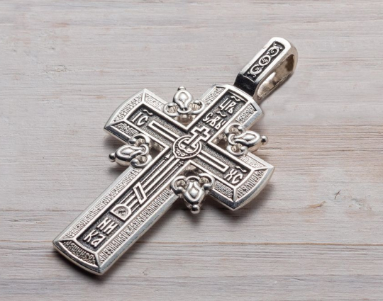 Серебряный голгофский крест- символ Распятого Иисуса Христа. По контуру изделие огибают слова из молитвы, с которой люди обращаются к Богу.