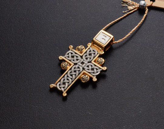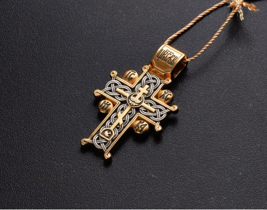 Изящный серебряный с позолоченной отделкой восьмиконечный крест, который является знаком Распятого Иисуса на Голгофе.