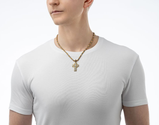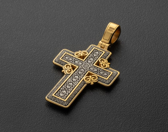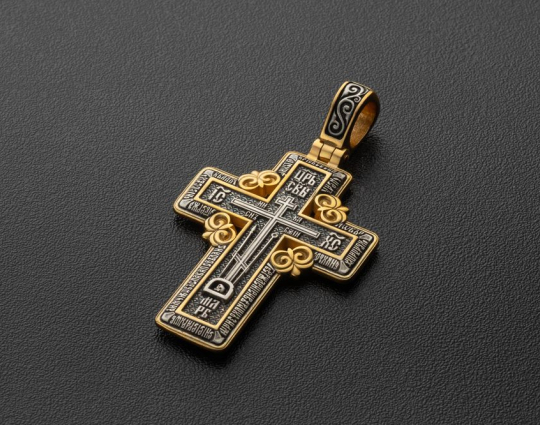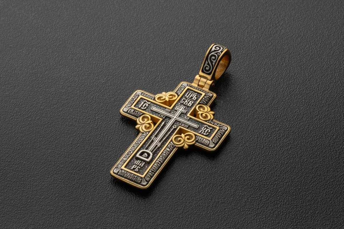 Серебряный голгофский крест- символ Распятого Иисуса Христа. По контуру изделие огибают слова из молитвы, с которой люди обращаются к Богу.