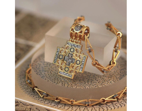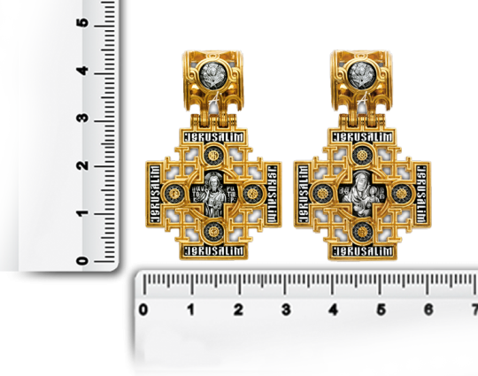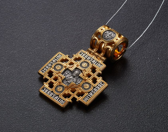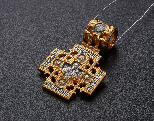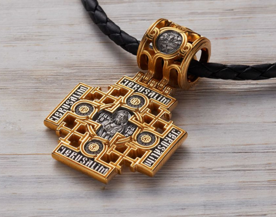 Серебряный крест с позолоченными элементами, состоящий из большого креста по центру, окруженного четырьмя малыми крестами. Этот крест с иерусалимской иконографией является символом Иисуса и четырех Евангелистов. На лицевую часть изделия нанесен образ Господа Вседержителя, представленный в виде царя и правителя мира. В руках у Спасителя Книга Бытия, символизирующая созданный Господом мир. Этот образ является наиболее важным в христианстве.