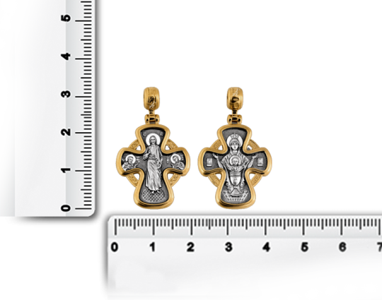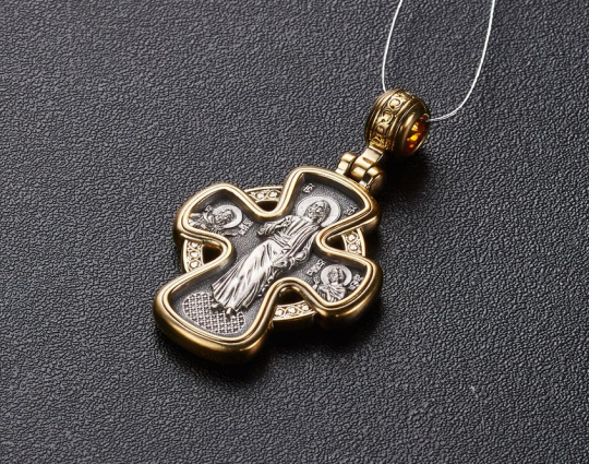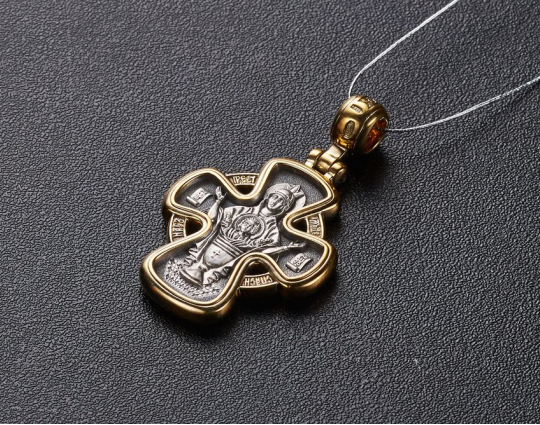 Серебряный крест с позолоченной окантовкой и изображением на лицевой части Иисуса Христа. Он представлен как Господь Вседержитель. В одной руке он держит книгу Бытия. Другая рука поднята в молитве. Книга Бытия часто сравнивается с Книгой Жизни, в которой записываются все действия человека. И, как говорят апостолы, беда тому, кого нет в книге.