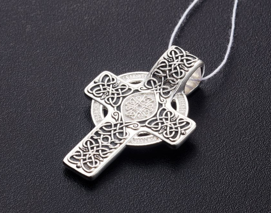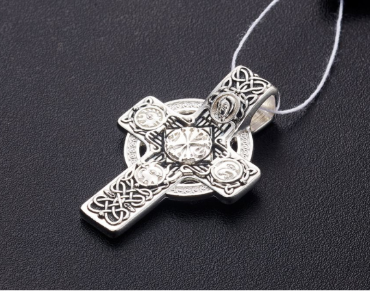 Изящный серебряный крест, украшенный орнаментом и древнейшим символом Иисуса Христа- Хризмой. Она нанесена на круг и помещена в центральную часть изделия. Складывается Хризма из букв греческого алфавита.