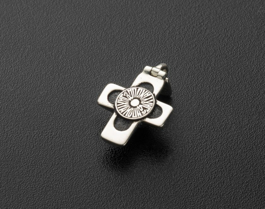 Этот равносторонний крест лаконичен, но не лишен изящности и красоты. На лицевой стороне размещен аметист. Это воплощение идеи о том, что центром духовной жизни каждого христианина является Евхаристия — причащение Тела и Крови Христовых.