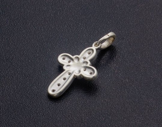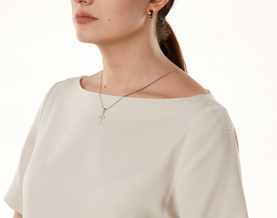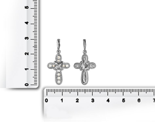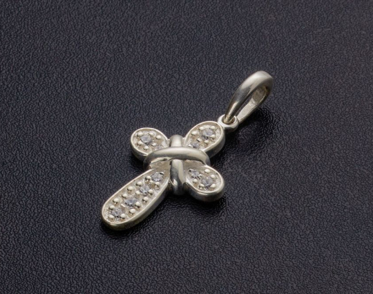 Изящный серебряный крест, который не только украшен фианитами на лицевой стороне, но и дополнен «салтиром» на пересечении горизонтальной и вертикальной планки.