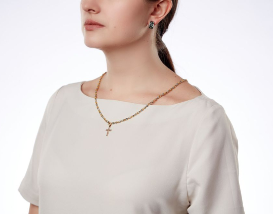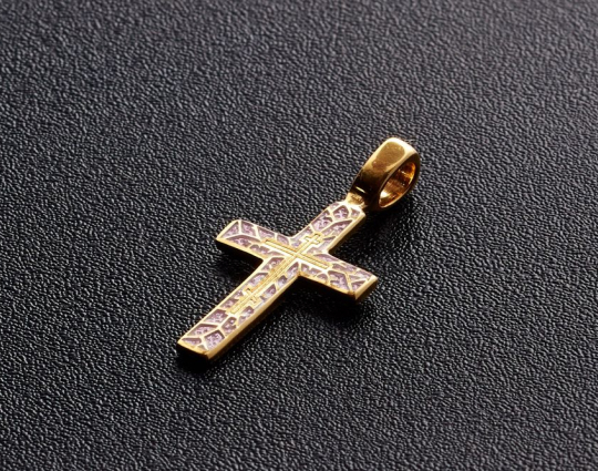 Серебряный крест простой геометрической формы, внутри которого - миниатюрный православный крест в обрамлении терновых ветвей, созданных при помощи эмалевой росписи благородных оттенков и изящной позолоченной отделки.