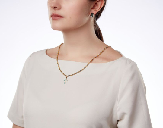 Серебряный крест простой геометрической формы, внутри которого - миниатюрный православный крест в обрамлении терновых ветвей, созданных при помощи эмалевой росписи благородных оттенков и изящной позолоченной отделки.