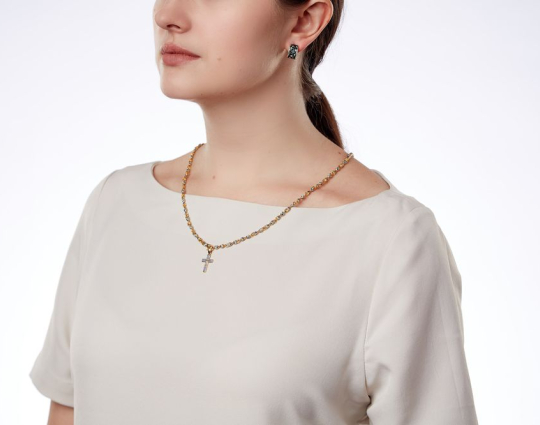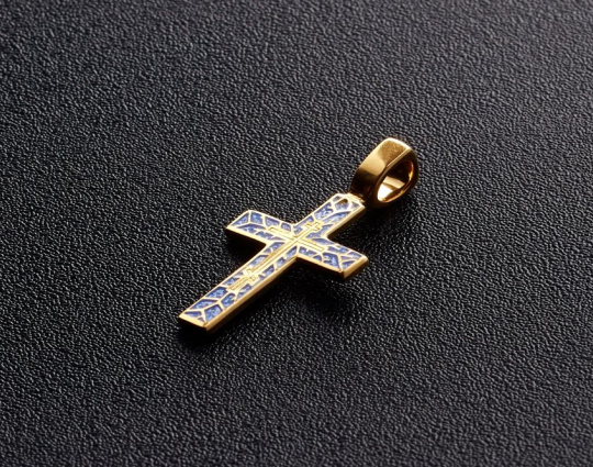 Серебряный крест простой геометрической формы, внутри которого - миниатюрный православный крест в обрамлении терновых ветвей, созданных при помощи эмалевой росписи благородных оттенков и изящной позолоченной отделки.