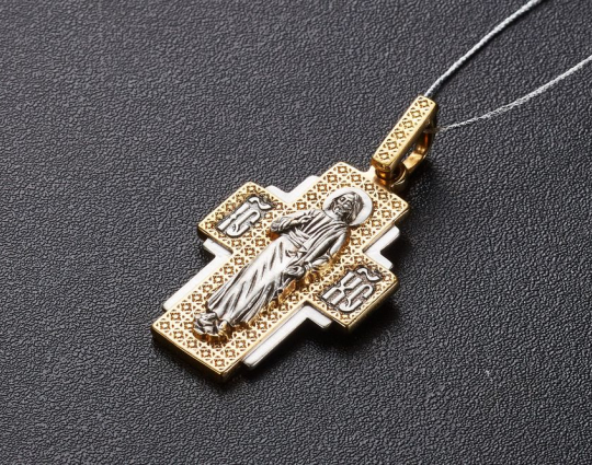 Массивный серебряный крест с позолоченной отделкой и изображением Господа на лицевой части. Он одет в легкие, развевающиеся одежды и как бы идет навстречу людям. Одна рука поднята в благословении, а в другой - свиток, который символизирует Новый Завет. Его Христос принес людям, чтобы они не забывали жить по заповедям любви и добра.