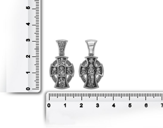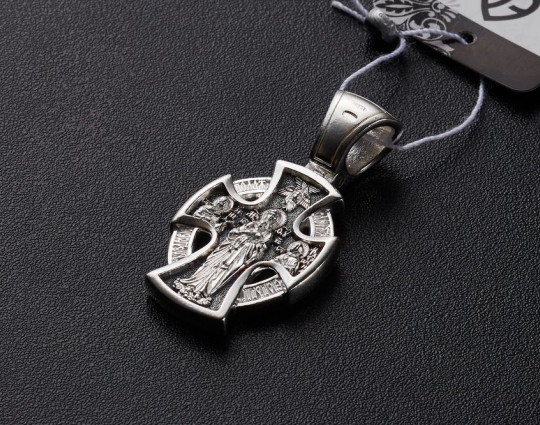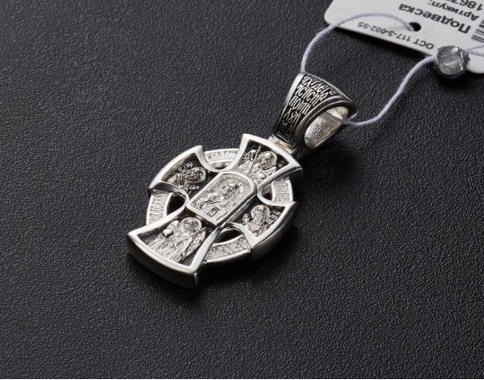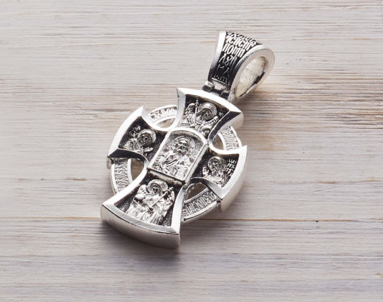 Серебряный крест с изображением лика Иисуса Христа на лицевой стороне. Он представлен как Господь Вседержитель. В одной руке он держит книгу Бытия. Другая рука поднята в молитве.