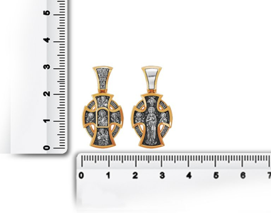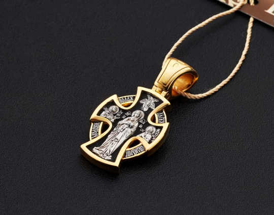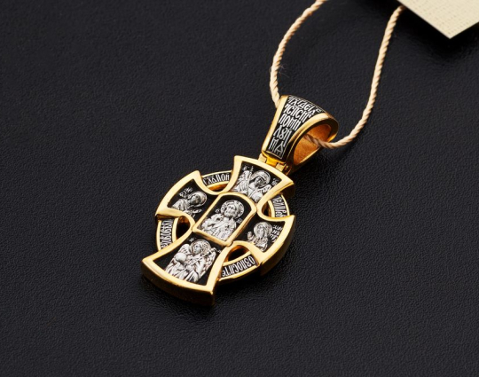 Серебряный крест с изображением лика Иисуса Христа на лицевой стороне. Он представлен как Господь Вседержитель. В одной руке он держит книгу Бытия. Другая рука поднята в молитве. Книга Бытия часто сравнивается с Книгой Жизни, в которой записываются все действия человека. И, как говорят апостолы, беда тому, кого нет в книге. Сбоку от него стоят Пресвятая Богородица и Иоанн Предтеча, склонившие свои головы в прошении. В верхней части креста нарисованы Великие Божьи помощники- Архангелы.