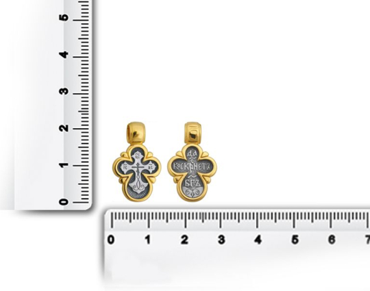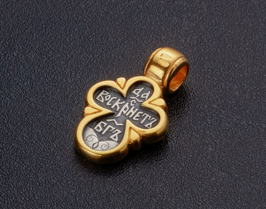 На лицевой части - объемный резной крестик на специально затемненном фоне. На обороте – священные слова «Да воскреснет Бог».