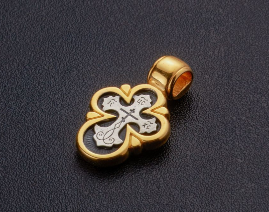 Изящный крест округлой формы, которая напоминает собой распустившийся цветок, что является символом того, что Крест- это не только боль и страдания, но жизнь, ведь Христос победил смерть.