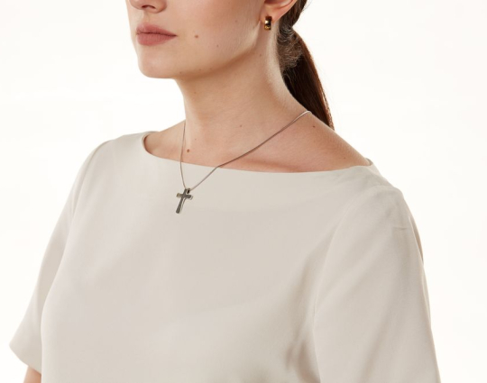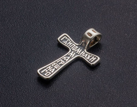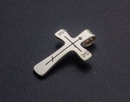 Простой и лаконичный серебряный крест, который символизирует своим видом, что залогом счастливой жизни является благочестие, умеренность во всем и молитвенное устремление к Богу.