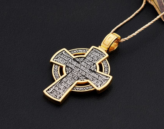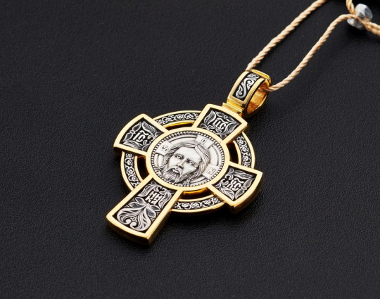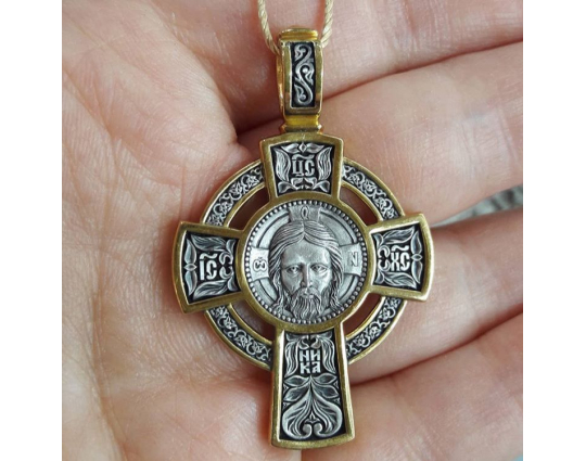 Серебряный крест с позолотой с изображением Нерукотворного образа Иисуса Христа, который считается у православных самой сильной защитой от всех возможных неприятностей как духовного, так и материального плана.