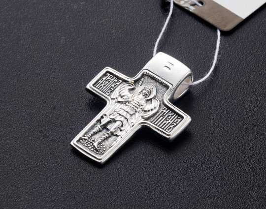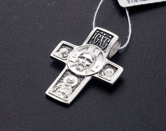 Серебряный крест с изображением главной святыни всех православных - Нерукотворного образа Спасителя, который явился на ткани по воле Иисуса Христа.  По бокам от Спаса Нерукотворного на горизонтальной планке креста расположены образы Пресвятой Богородицы и Иоанна Крестителя. В нижней части - Святитель Николай. Они - главные Божественные помощники человечества, которые просят за него перед Богом. Им молятся в сложных жизненных ситуациях, когда нужна защита или наставление свыше.
