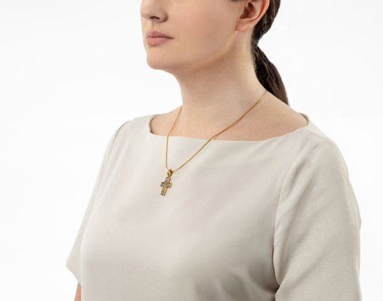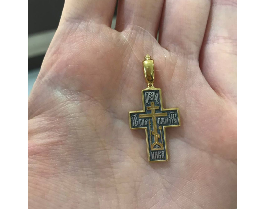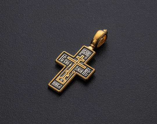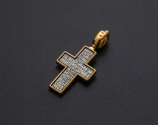 Серебряный нательный крест с Голгофой и молитвой на лицевой стороне и на обороте выполнен в стиле русских старообрядческих крестов. Они распространены среди православных, придерживающихся традиций и обрядов Русской Православной Церкви до середины XVII века.