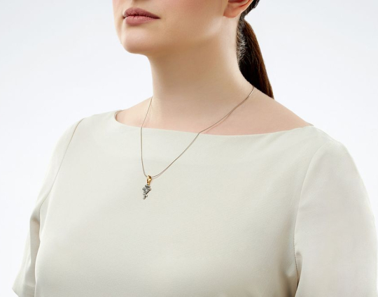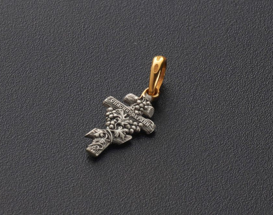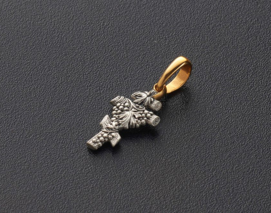 Серебряный крест выполнен в традиционном стиле. Его оплетает виноградная лоза с гроздью ягод. Это - символ Иисуса Христа, который называл себя виноградарем.