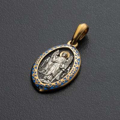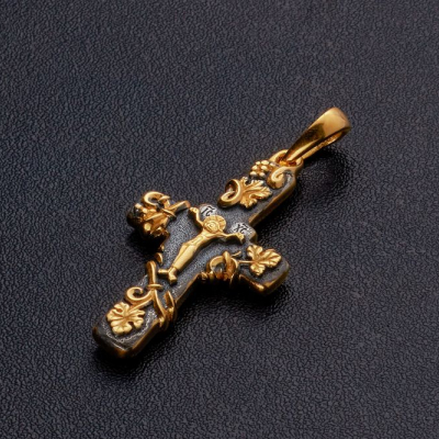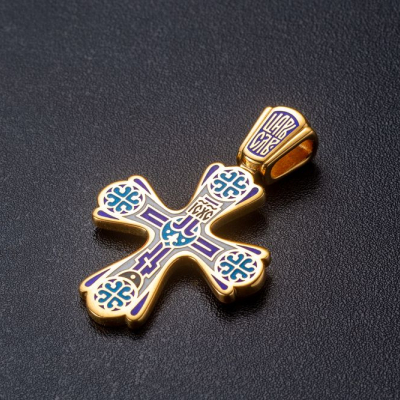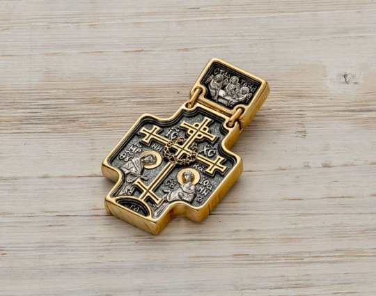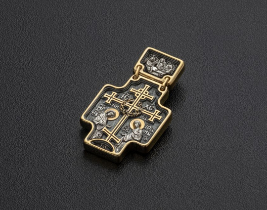 На внешней стороне изображен голгофский крест с терновым венцом, как символом страданий Спасителя, которые он перенес за все человечество. По бокам от него - предстоящие Святитель Иоанн и Богородица. В навершии размещено изображение Пресвятой Троицы.