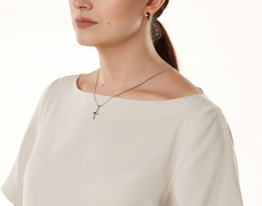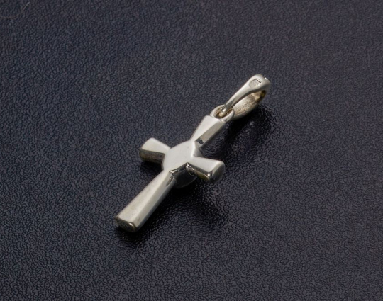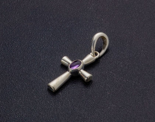 Маленький изящный серебряный крест с закругленными утолщенными концами и овальной вставкой из аметиста на пересечении планок. Аметист является символом великой жертвы Иисуса и знаком победы жизни над смертью.