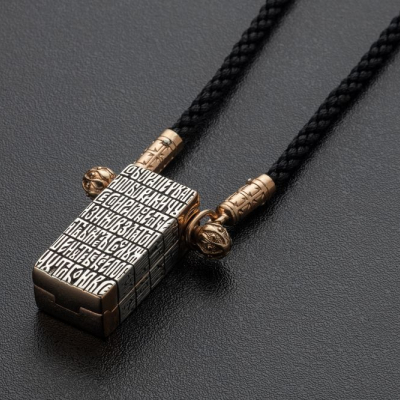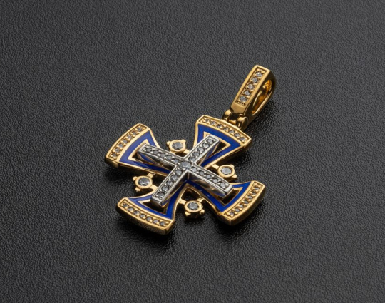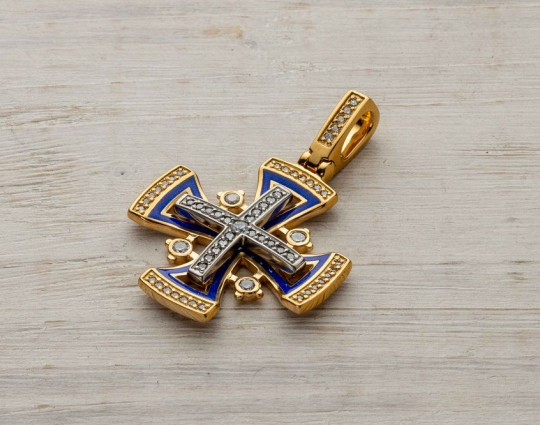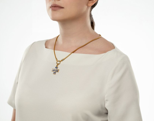 Нательный крестик выполнен из серебра с позолотой и эмалью, с использованием 58 кристаллов Swarovski. Кресты такой формы использовались орденом госпитальеров, или орденом Иоанна Иерусалимского. В Российской Империи крест такой формы еще назывался Георгиевским и находился на гербах некоторых городов.