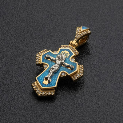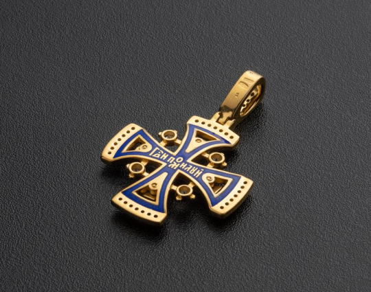 На крестике нет распятия, что символизирует чудесное воскрешение Иисуса Христа и торжество жизни над смертью. Позолота, вместе с эмалью и кристаллами, своей яркостью подчеркивает подобный смысл и добавляет изящности.