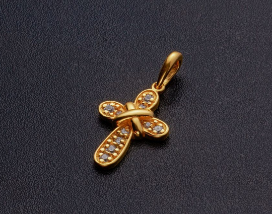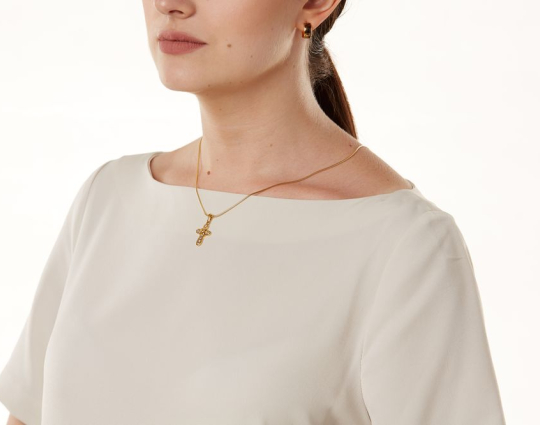 Изящный позолоченный крест, который не только украшен фианитами на лицевой стороне, но и дополнен «салтиром» на пересечении горизонтальной и вертикальной планки.