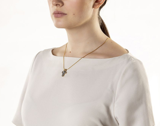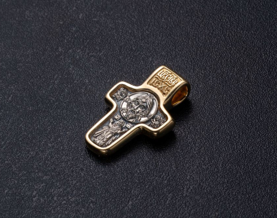 Православный крест, желтая часть которого выполнена из золота 585 пробы с серебро 925 пробы внутри (часть изделия серого цвета). На лицевой стороне - изображение Спаса Нерукотворного. Это - самая главная святыня всех православных верующих. Возникновение этой иконы имеет поистине чудесную историю и именно поэтому считается наделенной мощной защитной силой и ограждает от неприятностей того, кто носит ее при себе. В нижней части креста на этой стороне расположен образ Богородицы, которая раскинула руки в молитве за весь мир. Она наделена особым правом просить у Своего Сына за людей.