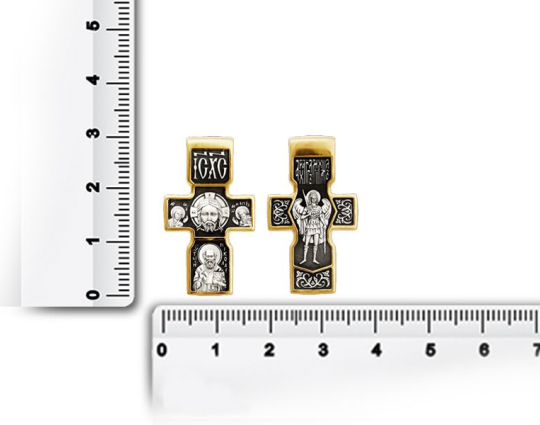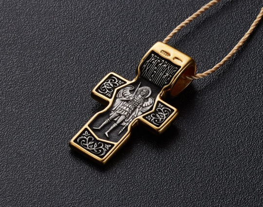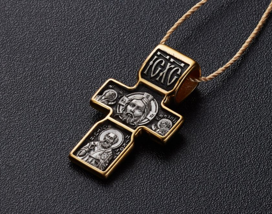 Крест из серебра с позолоченной отделкой и изображением Спаса нерукотворный. Этот образ имеет огромное значение у православных верующих и по значимости не уступает кресту и распятию. Сбоку от него изображены Предтеча Господень, Пресвятая Богородица и святой пророк Иоанн Креститель, они являются символом защиты человечества перед Богом. Снизу образка изображен Николай Чудотворец. Его просят о помощи в любых жизненных невзгодах.