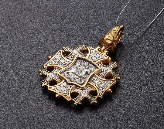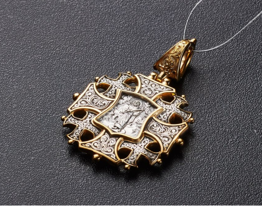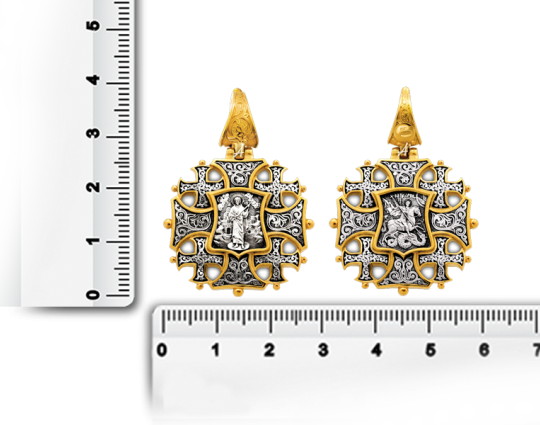 Серебряный крест с позолотой и изящной отделкой рельефным узором на лицевой стороне, состоящий из большого креста по центру, окруженного четырьмя малыми крестами. Этот крест с иерусалимской иконографией является символом Иисуса и четырех Евангелистов. На лицевую часть изделия нанесена икона «Спас с мечом».