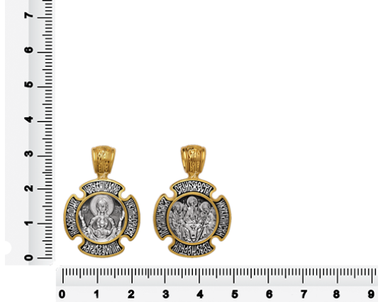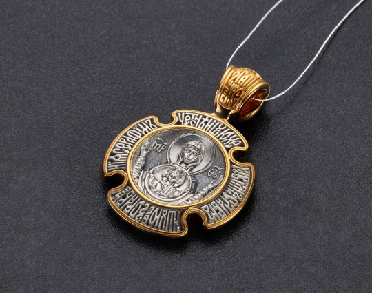 Оборотная сторона посвящена Пресвятой Богородице. На этом кресте она изображена в образе «Знамение». Считается, что Богоматерь наделена особым правом просить милости для людей у Своего Сына. Ее руки воздеты к Небу. И, православные говорят, что пока руки у Богородицы подняты в молитве, миру ничего не грозит, он будет в безопасности.