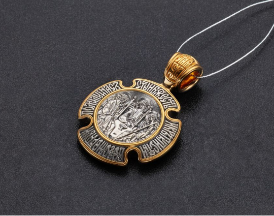 Соединенный с кругом крест из серебра с позолоченной отделкой. В нем, на лицевой стороне, изображение Троицы Ветхозаветной. На узких планках - священные слова.