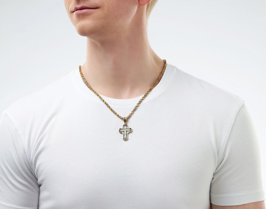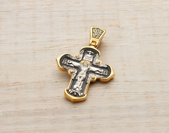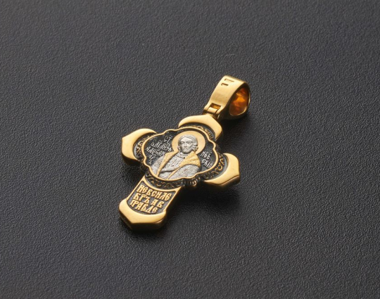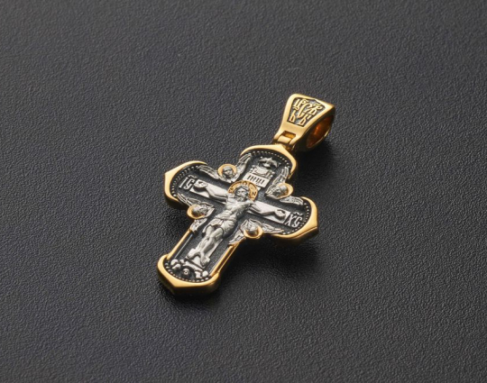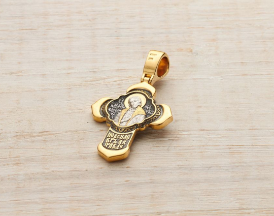 На лицевой стороне крестика из серебра 925 пробы с позолотой изображено Распятие. На ушке находится надпись "Царь Славы". На обороте - образ Александра Невского, Святого защитника Руси, мудрого правителя, покровителя воинов, защитников Родины, солдат, оберегающих свой дом от врагов.