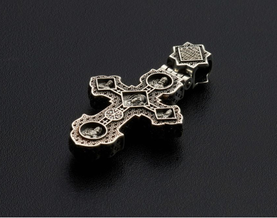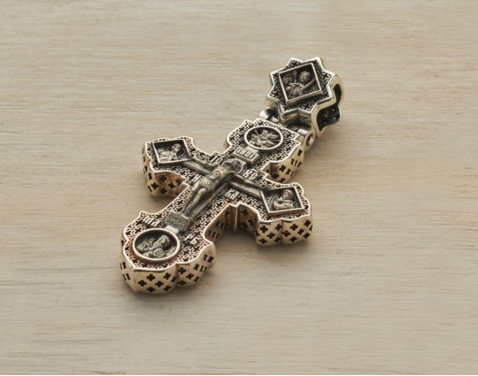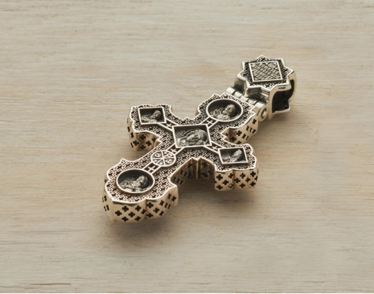 Ушко выполнено в форме восьмиконечной богородичной звезды. На лицевой стороне находится икона Ангела Хранителя, на обороте — короткая и действенная молитва: «Господи, помилуй нас, спаси и сохрани».