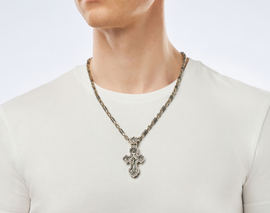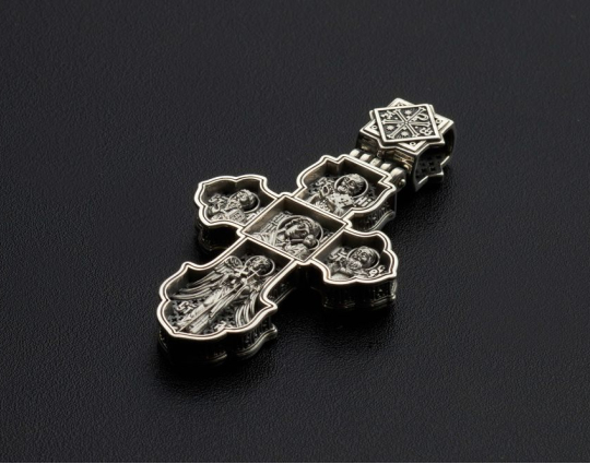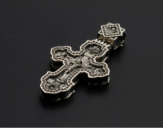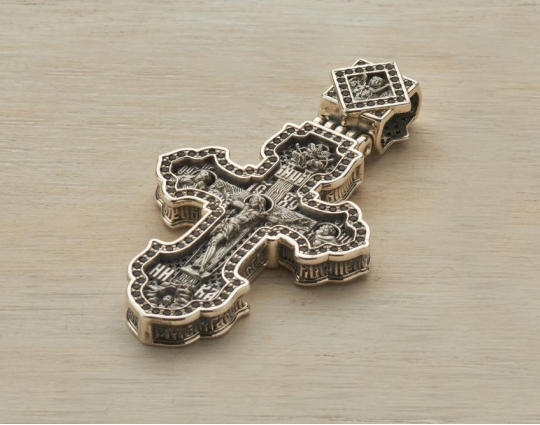 Православный крест выполнен из серебра 925 пробы с применением шпинелей. На лицевой стороне изображено Распятие как главный символ христианской веры, той жертвы, которую принес Христос.